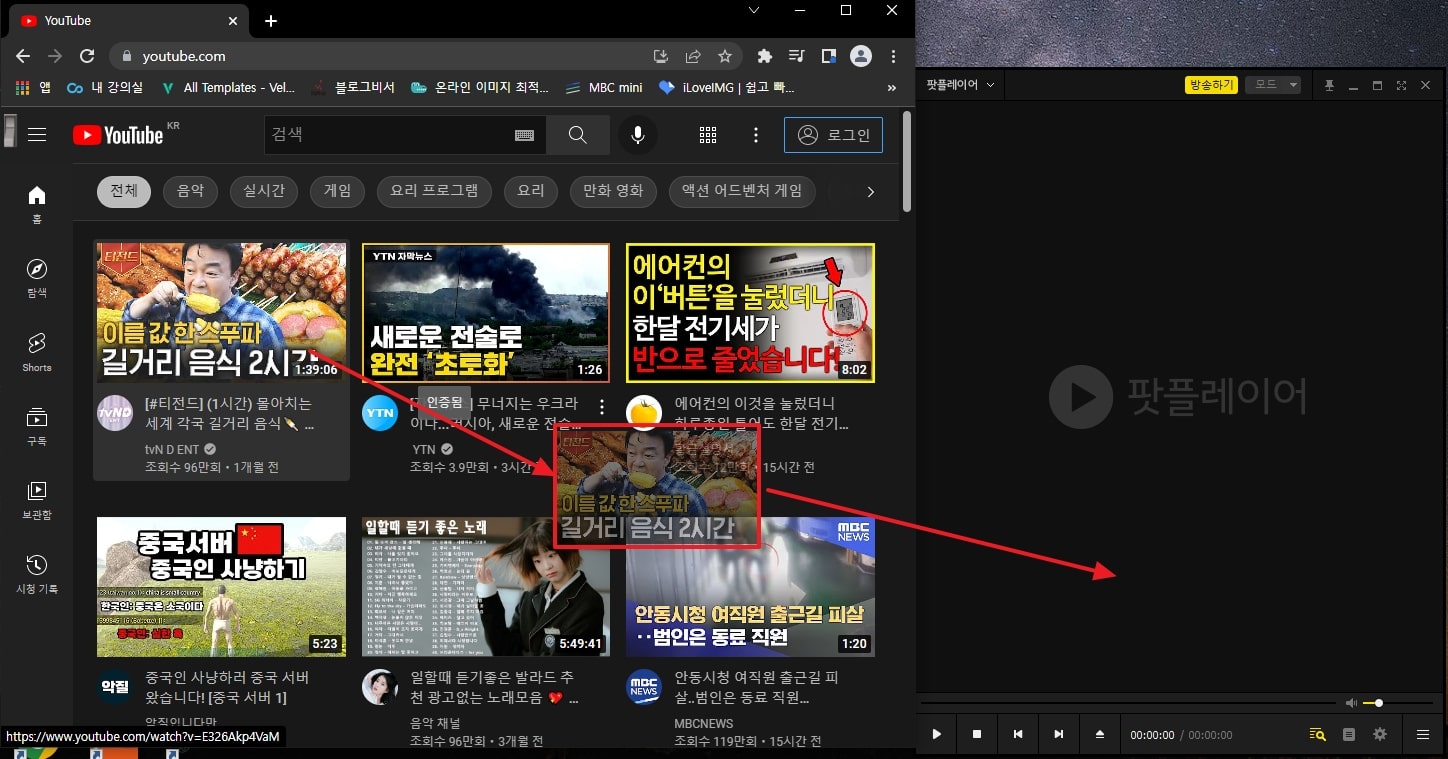 유튜브 화면에서 원하는 영상의 썸네일을 마우스로 누른 상태에서 팟플레이어 화면에 드래그 해줍니다.