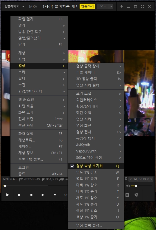 또한 화면에 우클릭을 하면 팟플레이어에서 제공하는 다양한 기능을 유튜브 영상에 적용시킬 수도 있습니다.